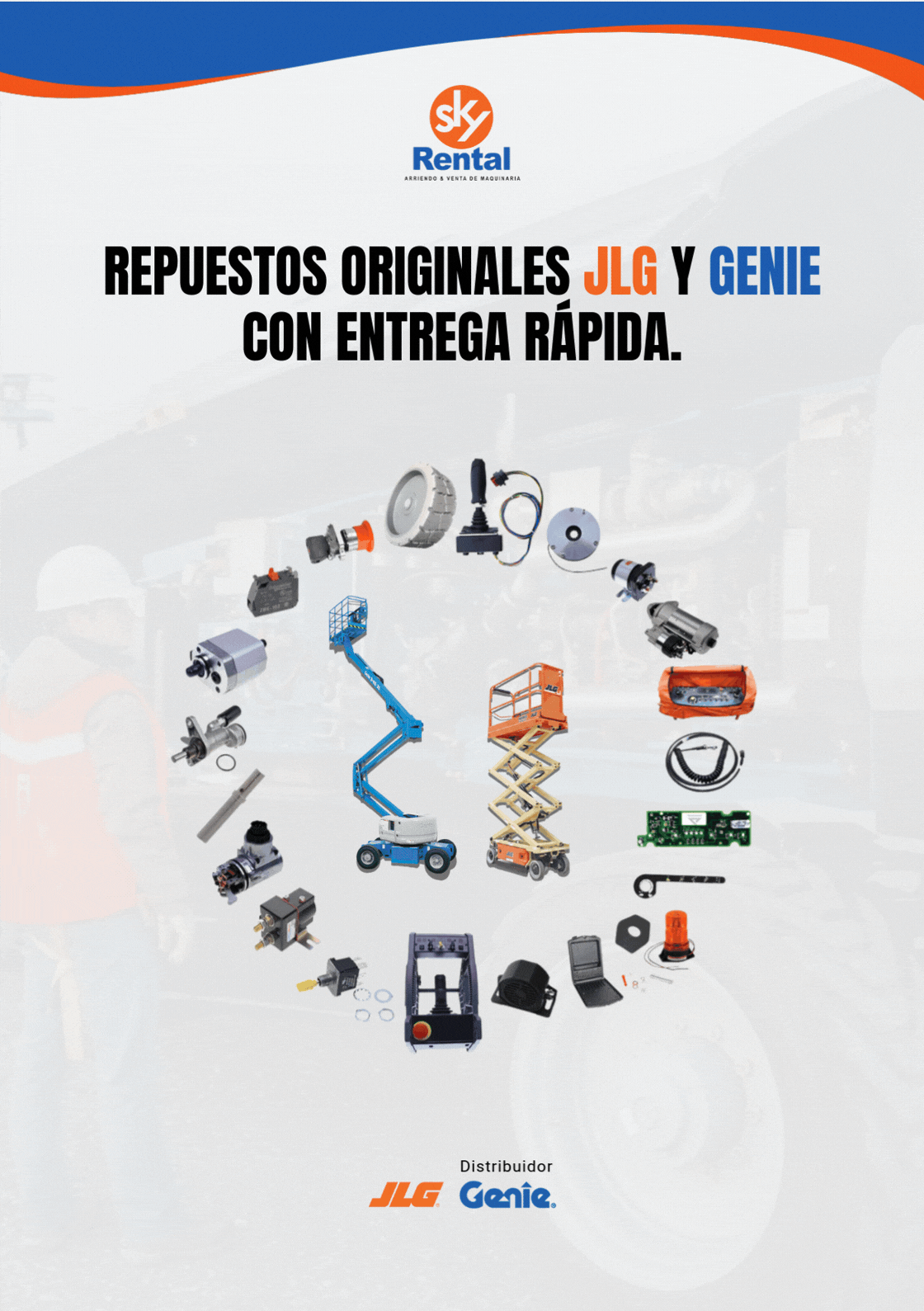 Sky Rental dispone de repuestos originales para plataformas JLG y GENIE, con asesoría especializada para asegurar compatibilidad y reducir tiempos de detención. Cuéntanos qué equipo tienes y te ayudaremos a identificar el repuesto correcto.